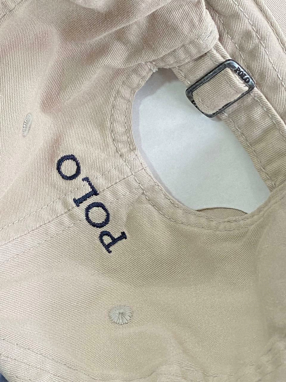 Nome da marca "POLO" gravado no fecho e na parte de trás do boné